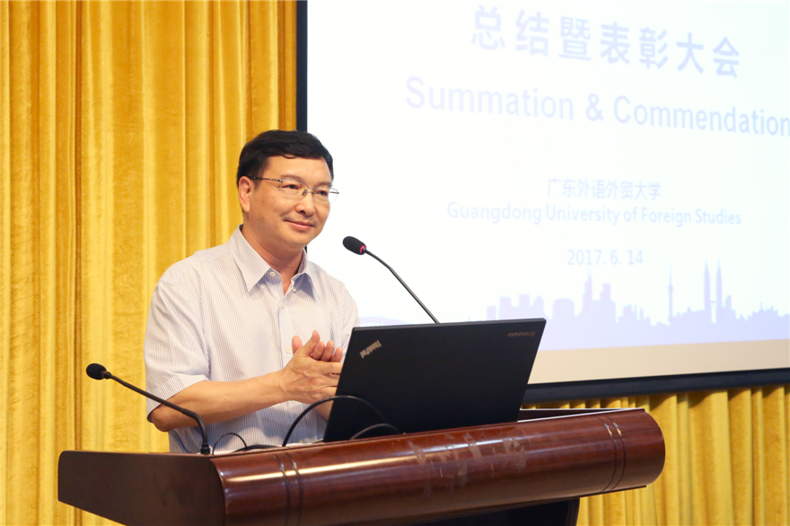 2017年6月14日下午,广外培育和践行社会主义核心价值观“铸魂·系扣”工程第一期项目中外价值观系列交流会活动在北校水上报告厅召开总结会。校党委副书记石佑启,党委宣传部部长胡文涛、留学生教育学院院长梁学宏、校团委副书记刘郎以及参与活动的中外师生参加了总结会。会上表彰了中外价值观征文比赛获奖的中外学生。